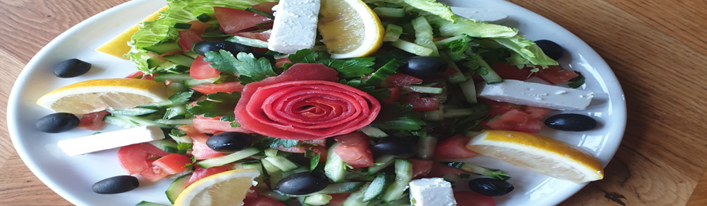 - 85 Chef Salat€ 8,50Eisberg, Tomaten, Gurken, Zwiebeln, Salami, Putenschinken, Ei , Drehspießfleisch