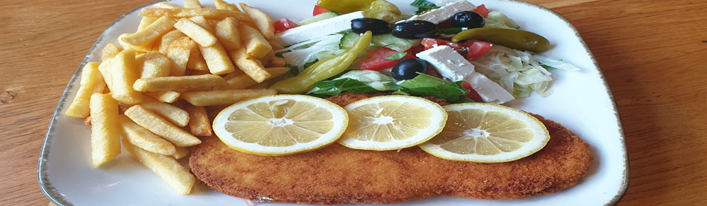 - 66 Ei Schnitzel€ 8,00mit EI und Goudakäse überbacken